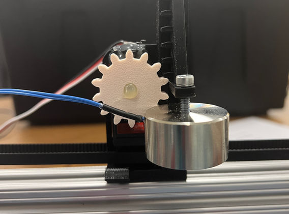 The end effector was engineered with packaging as a priority. Lightweight was a necessity so that the system could make moves as fast as possible. It would have been easier and more precise to use a much larger stepper motor, but that would have raised the weight and size of the end effector unacceptably. Instead, a servo motor was chosen. The servo motor had adequate accuracy and power to move the weight of the electromagnet and a piece without being over-specced (and overweight) for the job.